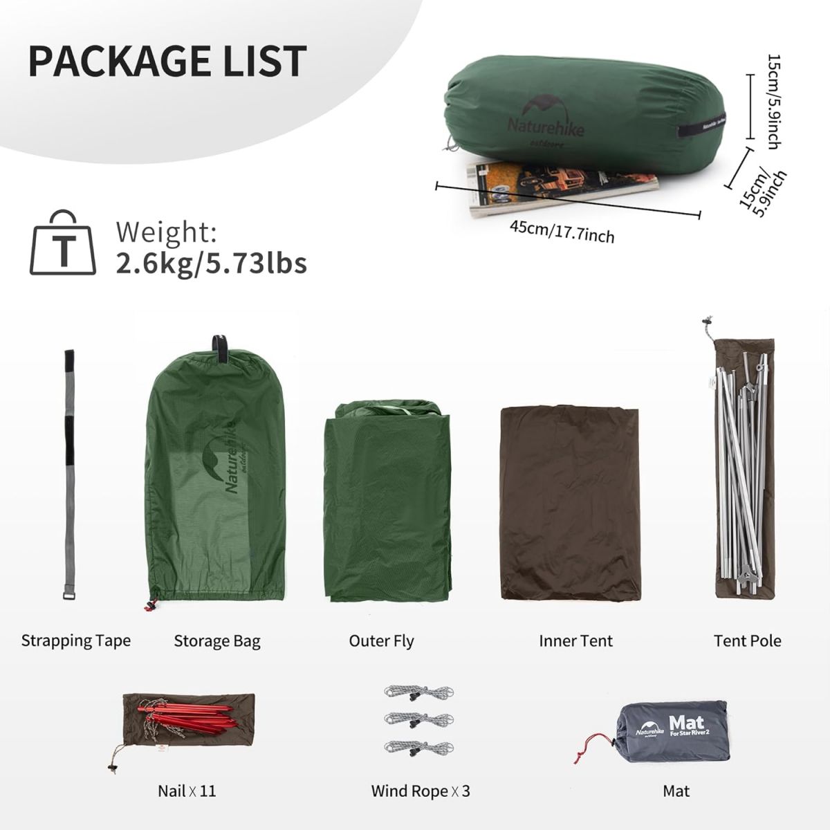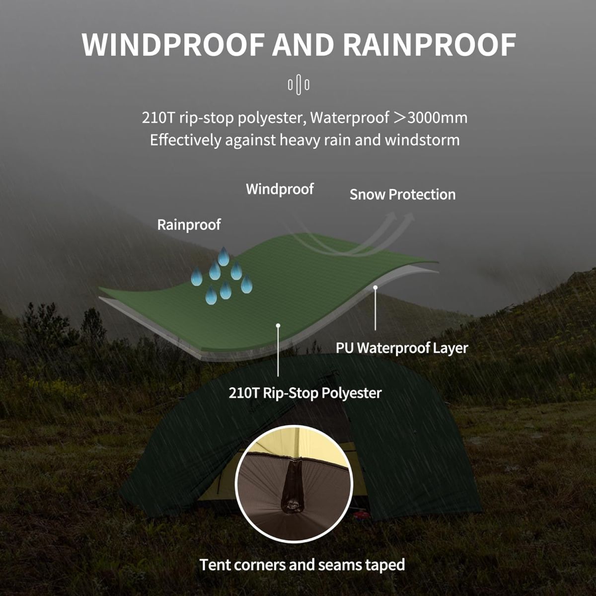 En busca de un peso ligero y mayor rendimiento del producto, esta carpa utiliza tela poliéster antidesgarro 210T, resistente al agua, con malla transpirable y varillas de aluminio 7001. Esta carpa es a prueba de viento, impermeable, transpirable y a prueba de insectos, lo que garantiza tu comodidad y segura a la hora de acampar.