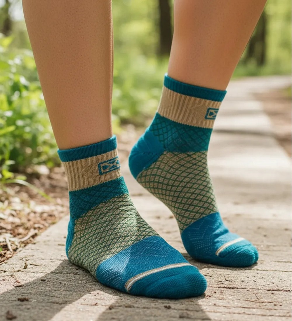 Puño doble elastizado, caña y pie anatómicos. Puntos estratégicos de amortiguación en caña y pie para disminuir los impactos. Costura de puntera extra plana, talón y puntera reforzados. Diseño reversible, lo cual permite utilizarlas de ambos lados manteniendo siempre sus beneficios. Secado rápido gracias a su composición.