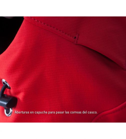 - Capucha fija con ajuste, para usar debajo del casco, posee aberturas para pasar las correas del mismo hacia el interior de la capucha.