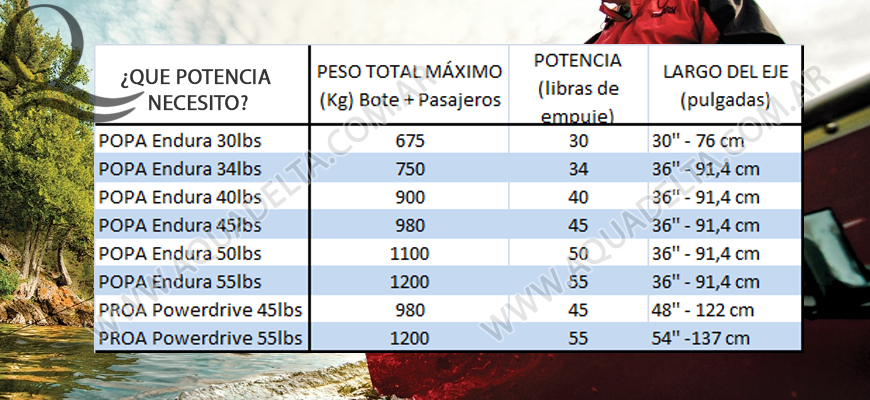 El empuje (libras – lbs) del motor debe ser proporcional al peso total del bote + pasajeros + equipo.
